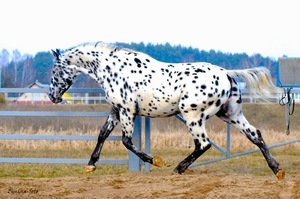 Фоновые масти разнообразны: рыжая, гнедая, буланая, вороная, соловая.- Пятна овальной формы, цветом совпадают с мастью-основой.
